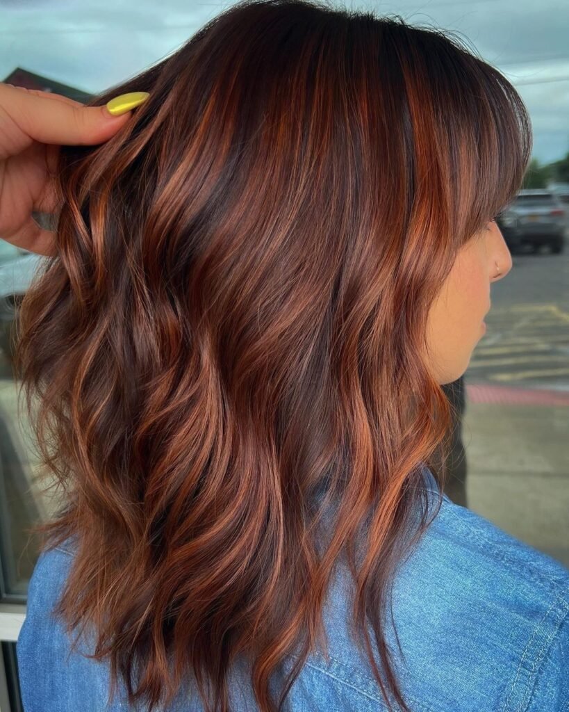 This shade is achieved by adding copper highlights over a chocolate base, perfect for medium to long wavy hair. Regular conditioning and color-protecting products will help maintain the depth and warmth of this look.