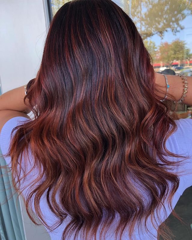 To achieve this, start with a dark base and blend in red and copper highlights using a balayage technique.