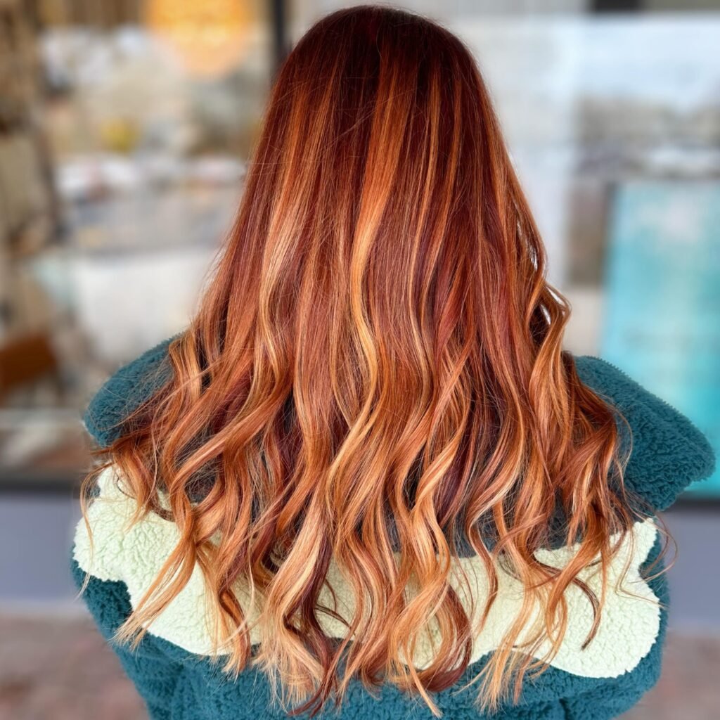 Starting with a deep red base, vivid copper and warm golden tones are added through a balayage technique to create a natural, sun-kissed appearance.