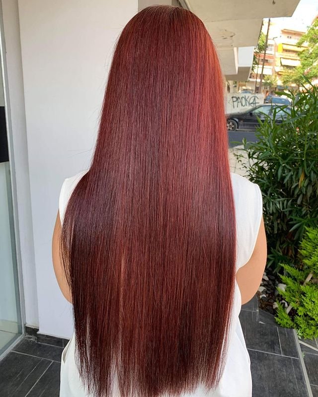 The deep burgundy red copper straight look is sleek and elegant, offering a rich, solid color.