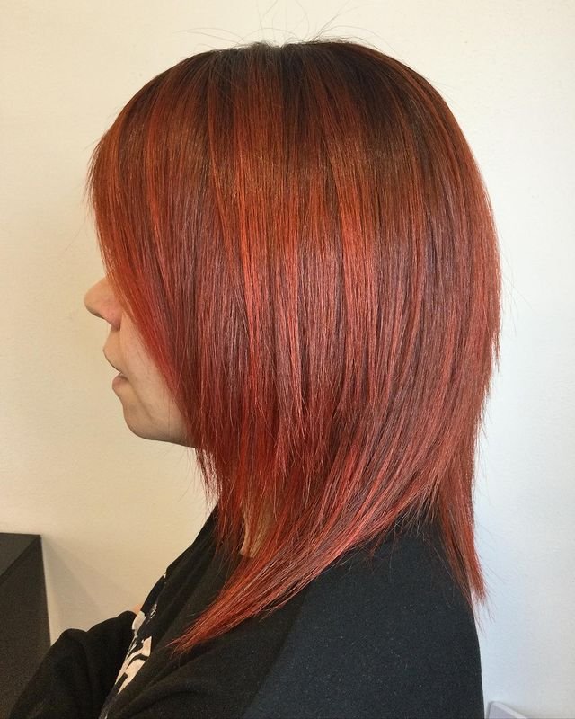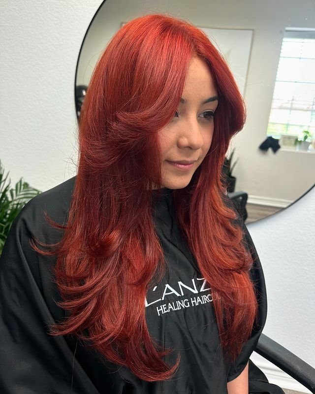 The bright layered red copper look combines vivid red tones with a coppery finish, perfect for adding depth to layered hairstyles.