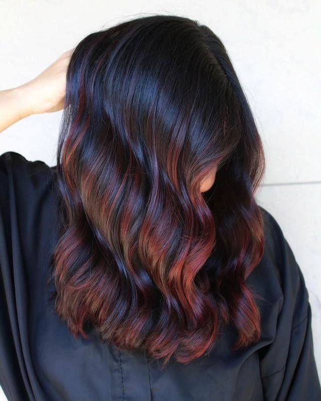 The balayage technique is used to hand-paint deep red and copper hues over a black or dark brown base, offering a seamless transition and a hint of warmth.