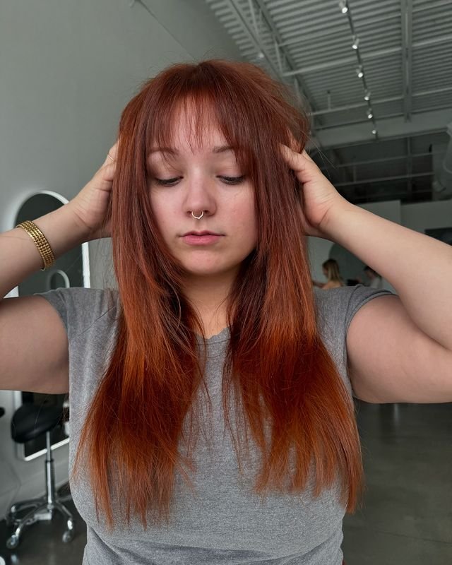The fiery red copper with wispy bangs look combines a bold red copper color with soft, wispy bangs for a fresh, modern style.