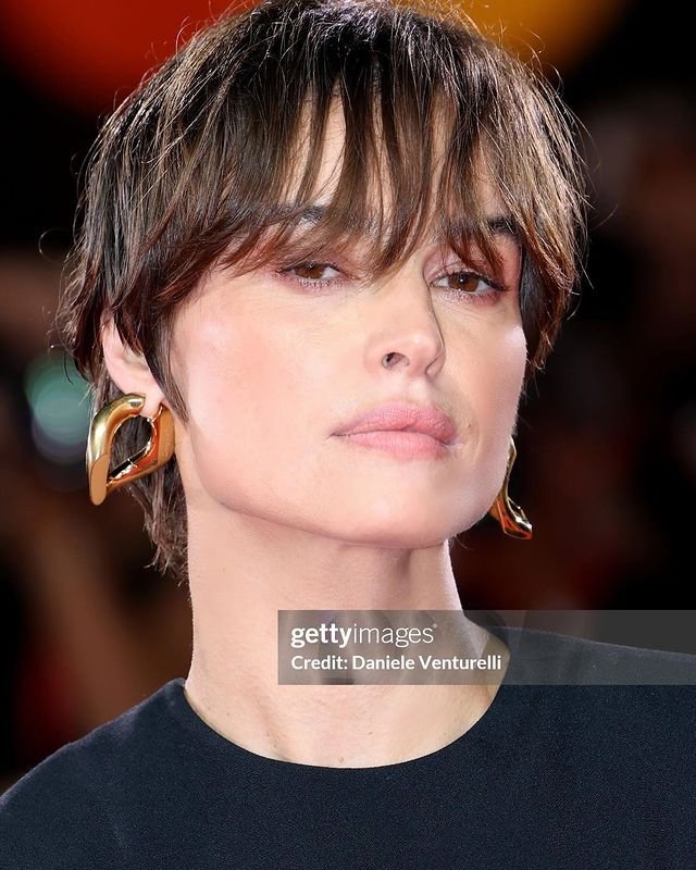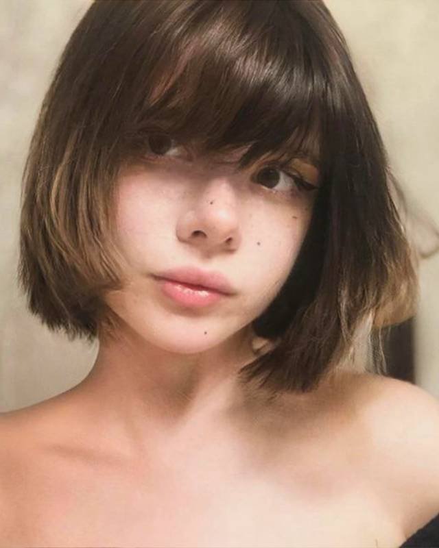 The short bangs draw attention to the forehead and cheekbones, creating a sharp, defined look.
