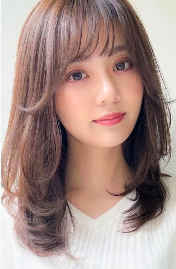 The layers add subtle volume, and the full bangs cover the forehead, balancing the face’s proportions. For styling, use a heat protectant and a flat iron to keep the bangs smooth and even.