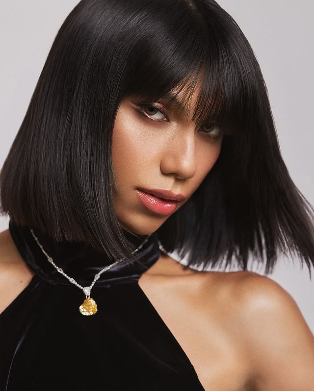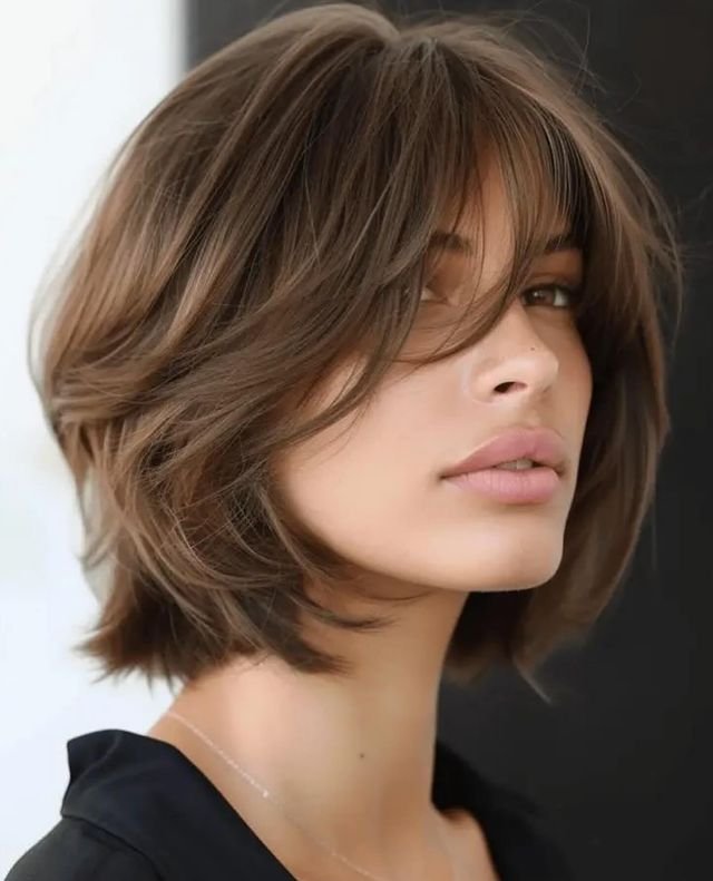 The bob is slightly textured, adding volume, while the side-parted bangs soften the overall look, directing attention to the cheekbones.