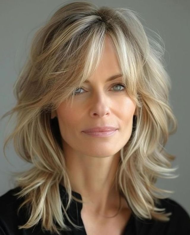 The layers frame the face while the feathered bangs gently cover the forehead, creating a balanced, airy look.