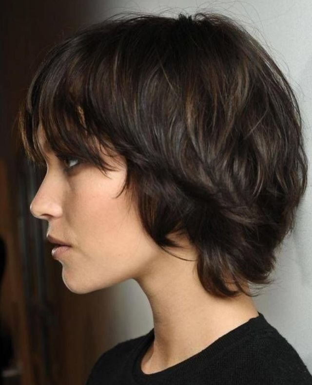 The short shag cut with textured bangs brings edge and movement to round faces. With layers that add volume and dimension, this cut is perfect for reducing roundness while adding angles.