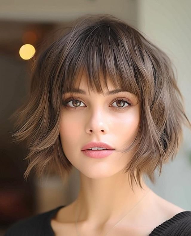 A soft layered bob with full bangs is perfect for round faces, as it gives structure while keeping the look soft and approachable.