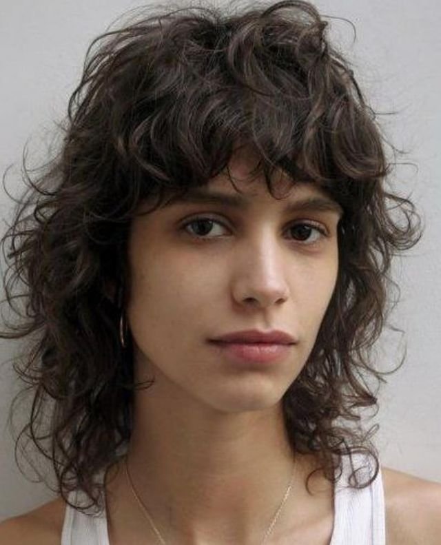 This curly shag with soft bangs offers a casual, voluminous look, ideal for round faces. The layers add dimension, allowing natural curls to frame the face gently.