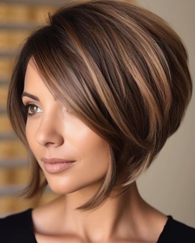 The bob is longer on one side, which draws the eye downward and elongates the face. Side bangs add a soft touch, creating balance without covering too much of the face.