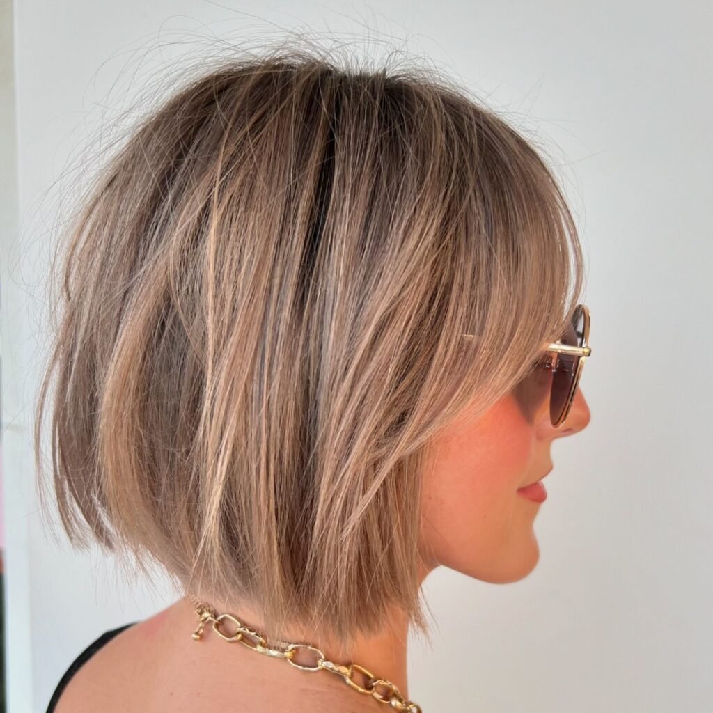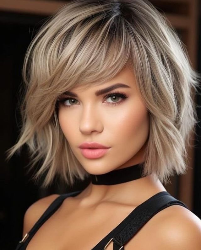 A textured blonde bob with side-swept bangs brings a fresh, youthful vibe, perfect for round faces. The texture adds volume, while the side-swept bangs break up the roundness, highlighting cheekbones.