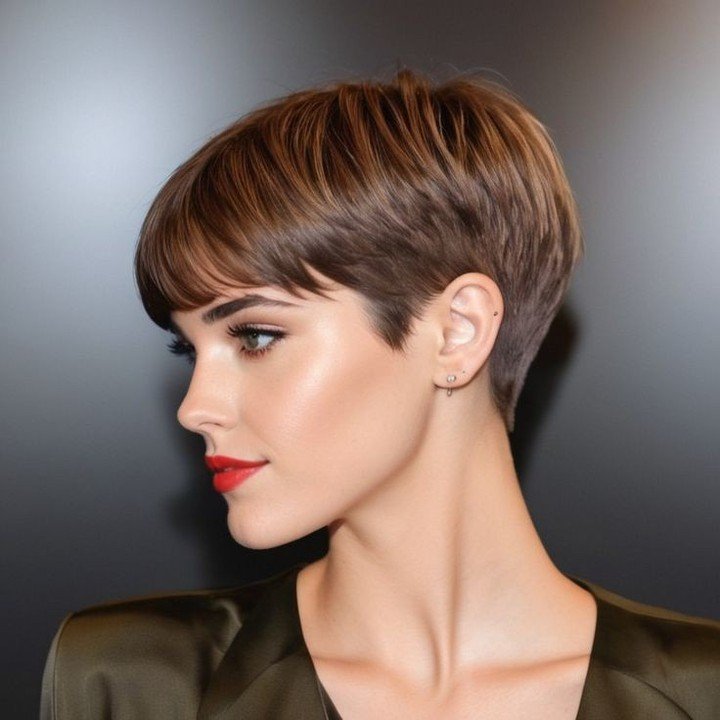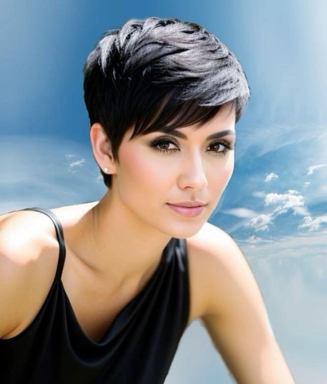 The pixie cut highlights facial features while providing a contemporary edge, suitable for any age.