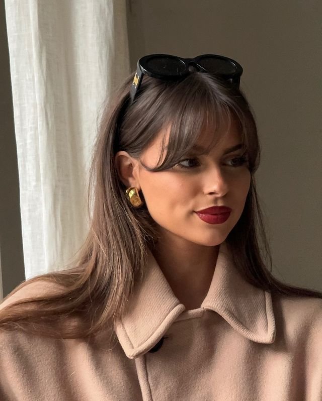 The full fringe draws attention to the eyes, while the soft waves add a playful yet sophisticated vibe.