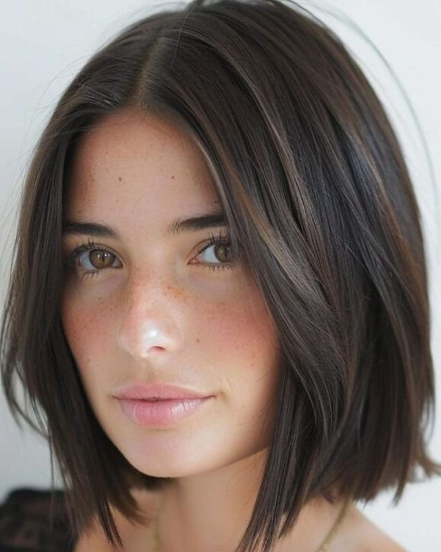 A soft A-line bob with a middle part provides balance and subtly frames a round face. This style is slightly longer in the front, creating a gentle elongating effect, while the middle part gives symmetry.