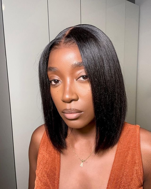 This sleek straight bob style features a middle part and a perfectly straight, chin-length bob. To get this look, start by blow-drying the hair, then use a flat iron to press it in small sections for a sleek, shiny finish.