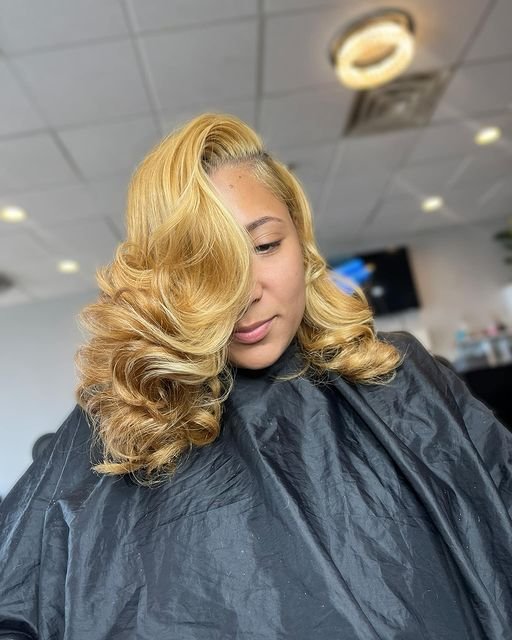 This golden blonde curly silk press features bold, voluminous curls and a warm blonde tone. After performing a silk press, use a medium-barrel curling iron to add curls, then separate them slightly for a more voluminous look.