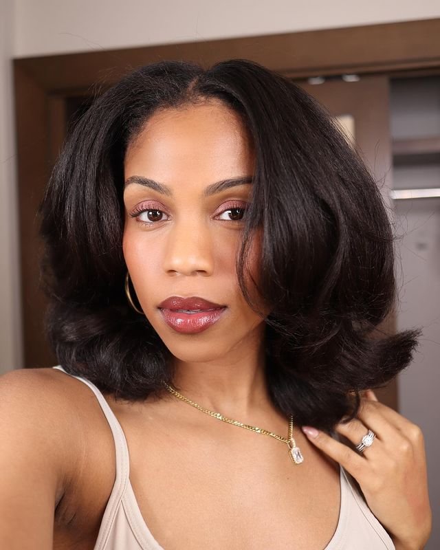 This side-parted silk press with bouncy ends exudes elegance and volume. Start by pressing the hair until smooth, then create a deep side part to add drama. Use a round brush or large-barrel curling iron to give the ends a bouncy, curled effect.