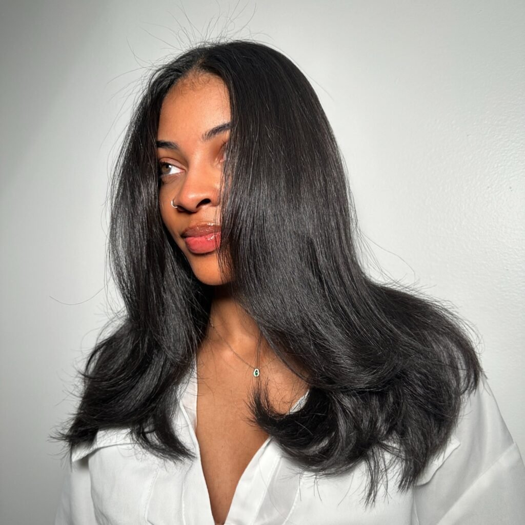 This soft flip silk press with layers combines layers with outward flips for a voluminous effect. After pressing, use a large curling iron or round brush to flip the ends gently.