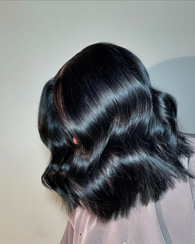 Next, use a flat iron to press the hair until smooth and glossy, then use a large-barrel curling iron to create soft curls. This style is perfect for adding volume and dimension to short hair, making it a great choice for anyone wanting a polished, high-glam look that still feels natural.