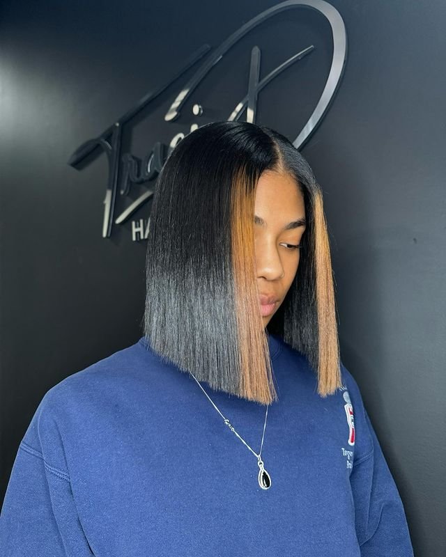 The blunt bob silk press with highlights adds boldness and color to a classic bob. After pressing the hair to achieve sleekness, incorporate blunt edges for a sharp, defined look.