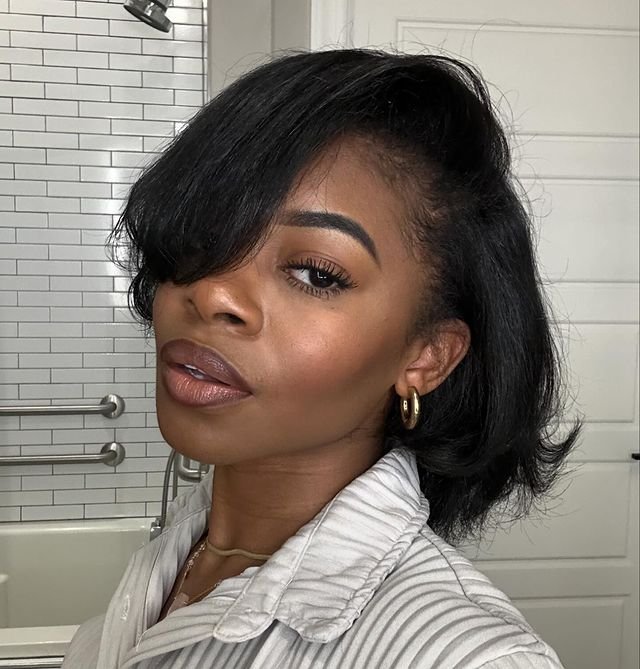 This side-swept bangs silk press features soft, flowing bangs that add a hint of glamour to short hair. Begin by pressing the hair for a smooth, glossy base, then create a deep side part to sweep the bangs across the forehead.