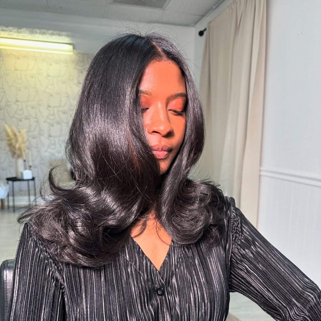 This voluminous silk press with a middle part is a perfect blend of sleekness and bounce. To achieve this style, start with a silk press for a smooth base, then use a large round brush to curl the ends outward, creating volume and body.