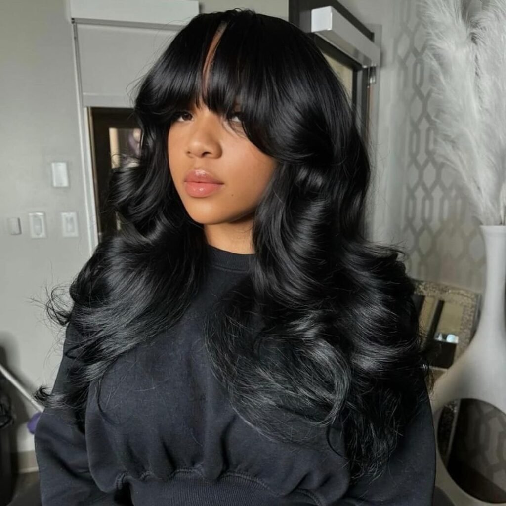 The middle part frames the face evenly, giving a balanced look. This style is ideal for those wanting a polished, glamorous appearance with added fullness, making it suitable for both everyday wear and special events.