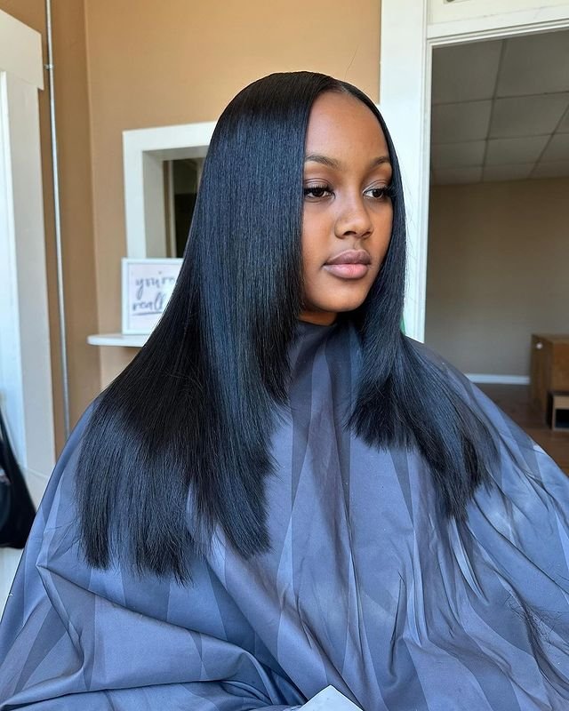 The sleek middle-part silk press is a minimalist style that showcases the hair’s natural shine and smoothness. Start by pressing the hair in small sections to achieve an ultra-sleek look.