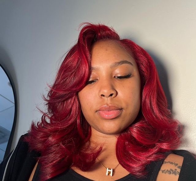 The vibrant red silk press with curls makes a bold statement with its bright color and voluminous curls. After achieving a sleek silk press, use a curling iron to create soft, defined curls throughout the hair.