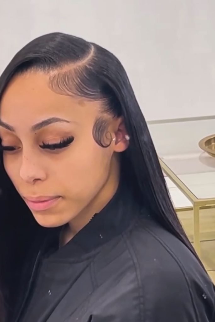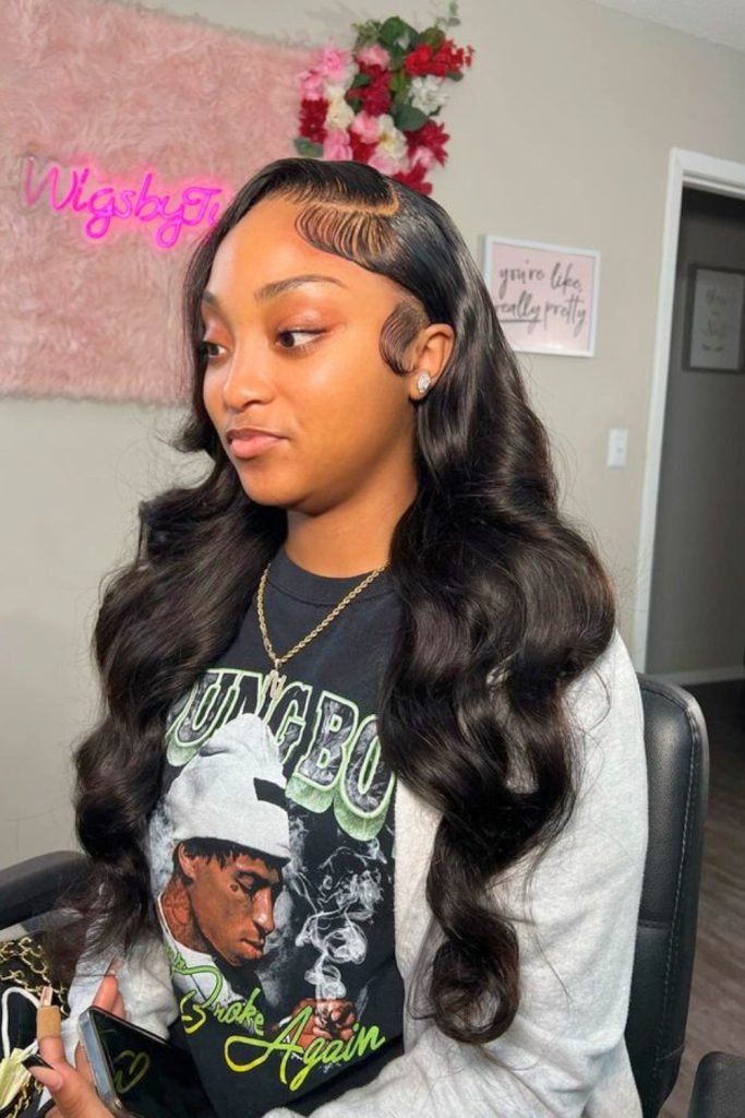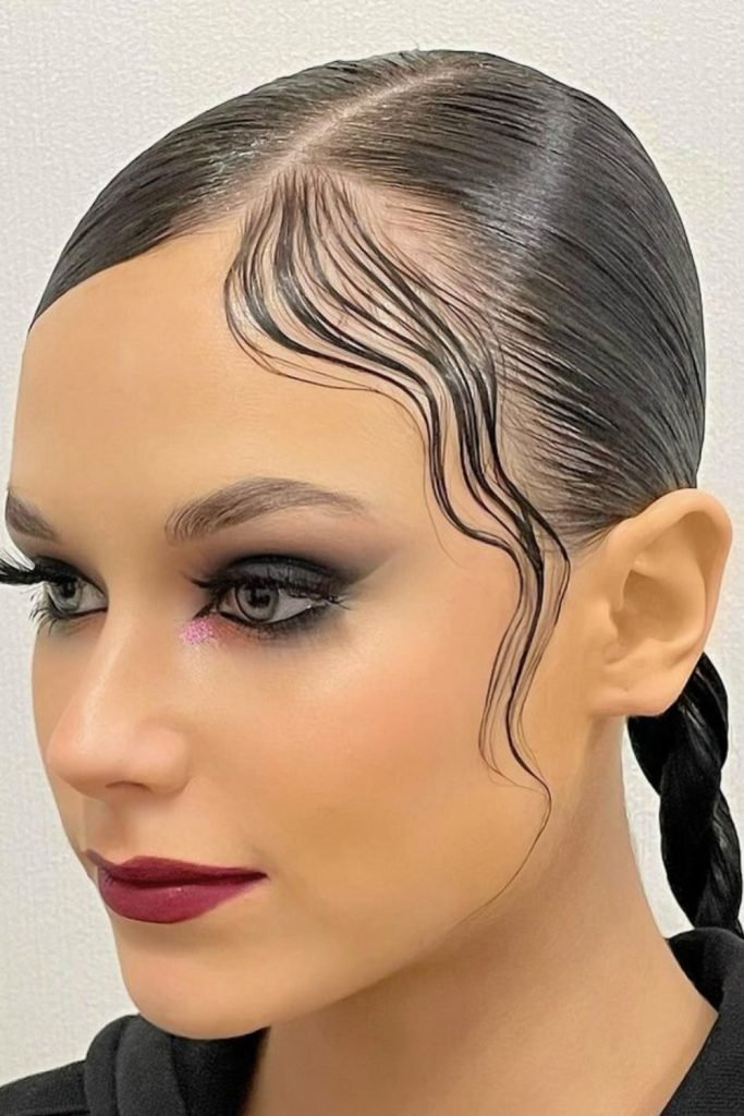 The hair is parted deeply on one side, creating a dramatic sweep across the forehead. The baby hairs are styled into elegant swirls, enhancing the overall sophistication.