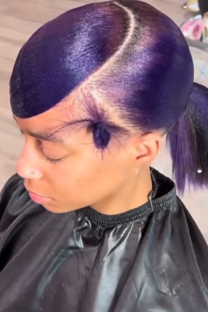 Side-parted sleek ponytail with a purple hue brings a bold and modern twist to a classic style.
