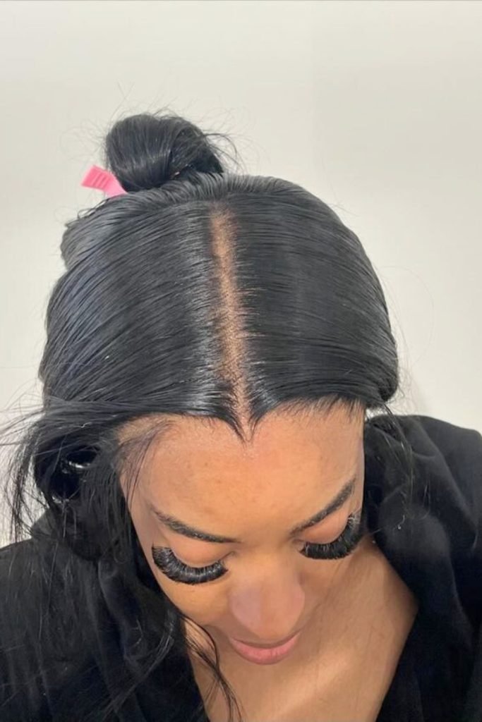 Sleek side-parted top knot blends simplicity with elegance. This hairstyle features a clean, deep side part that transitions into a smooth, tightly secured top knot at the crown.