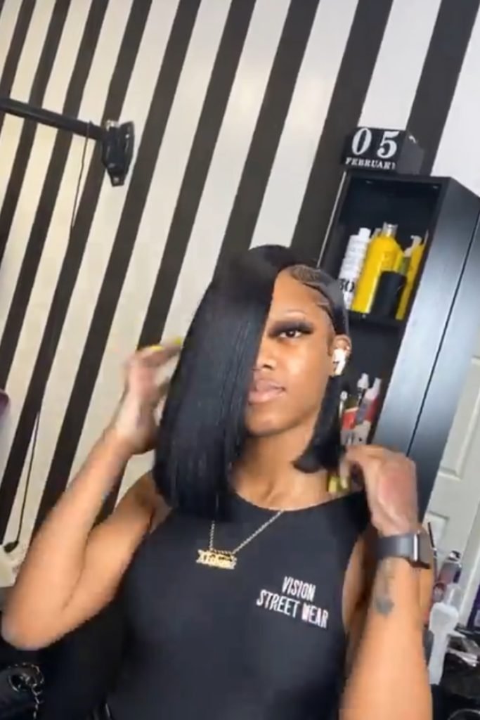 This sleek side-part hairstyle is all about precision and elegance. The hair is meticulously straightened and parted deeply to one side, giving a smooth, polished look.