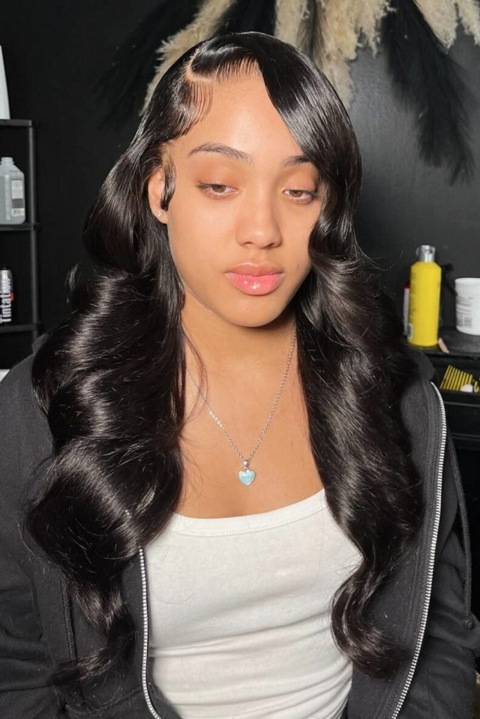 Side-parted glam waves combine vintage elegance with modern flair. This hairstyle features a deep side part, with sleek, glossy waves cascading over the shoulders.
