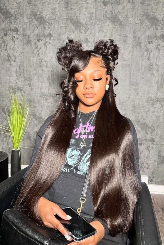 The sleek, straight lengths cascade down, adding a touch of elegance to the playful buns.