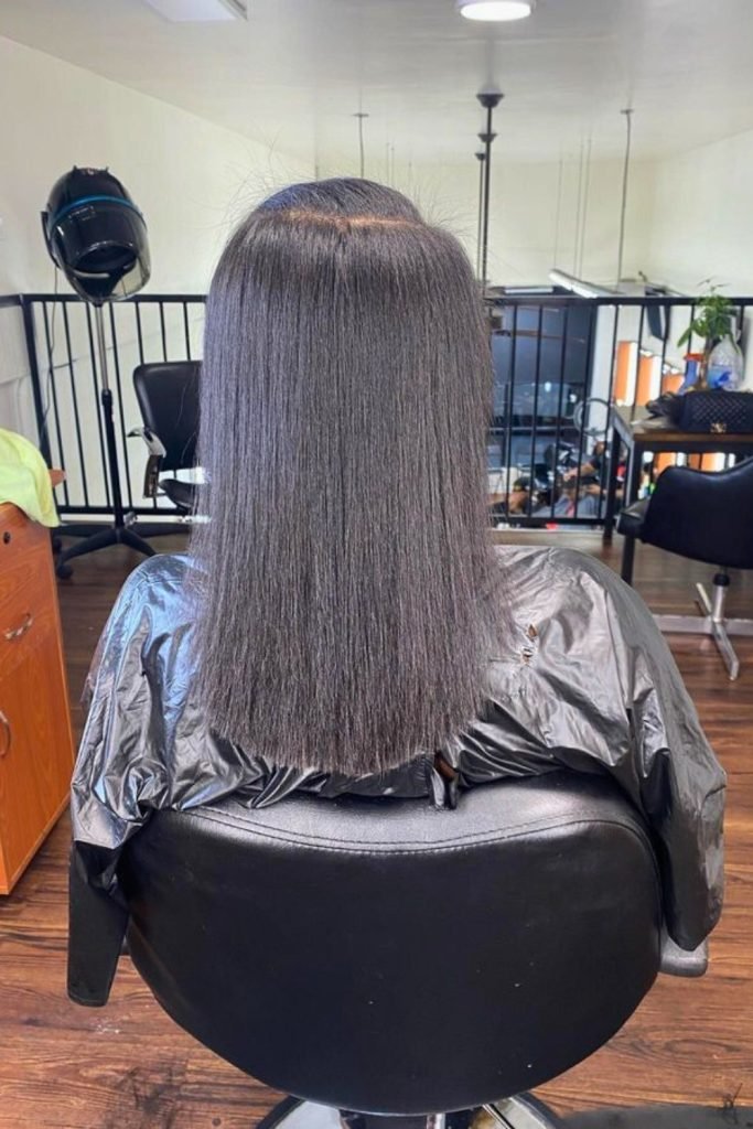 The hair is straightened to perfection, allowing it to cascade down the shoulders with a sleek finish.