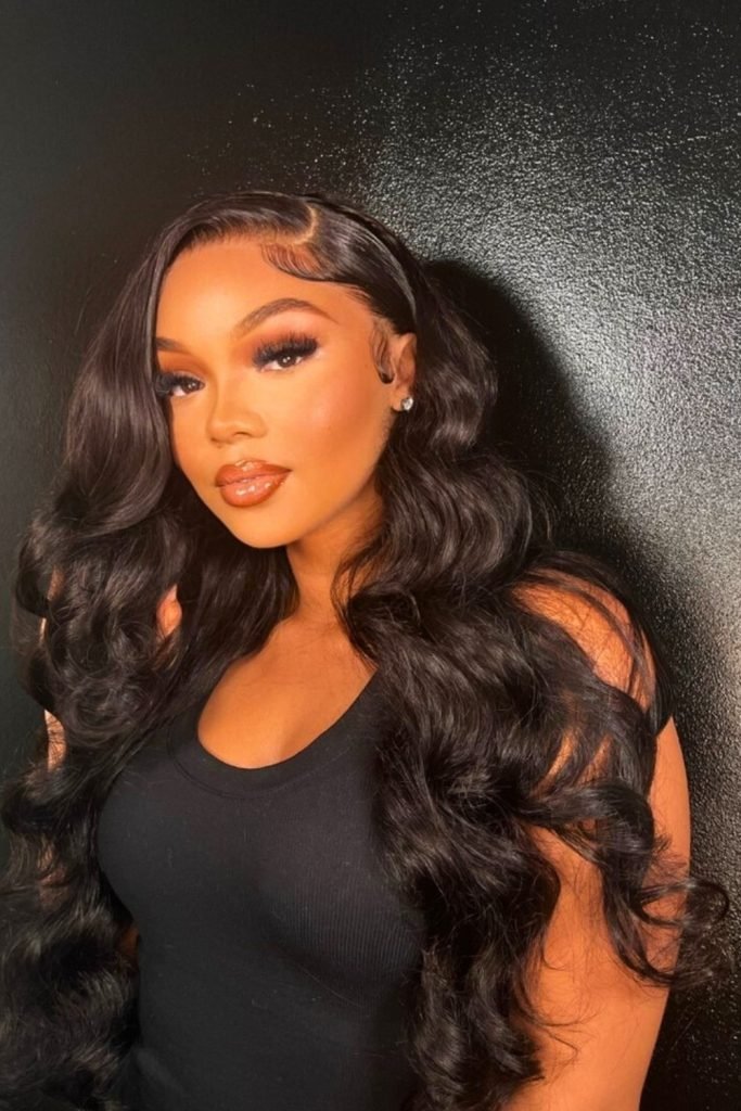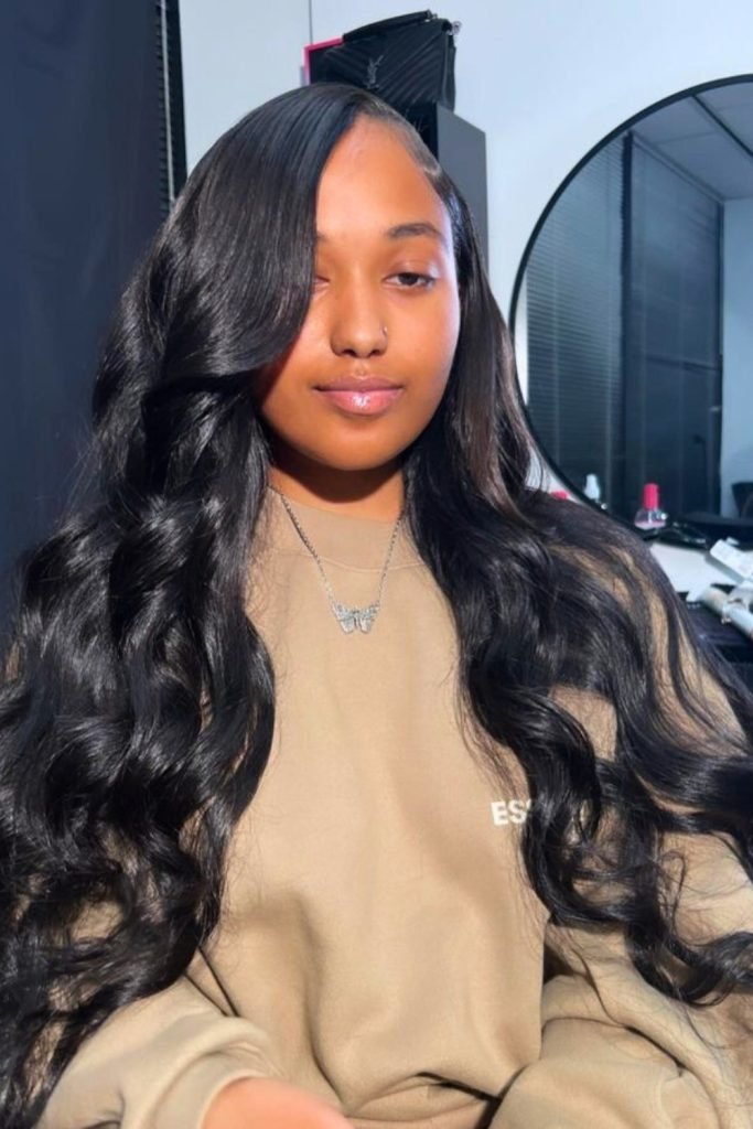 The sleekness at the roots contrasts beautifully with the full-bodied waves, creating a balanced and eye-catching style.