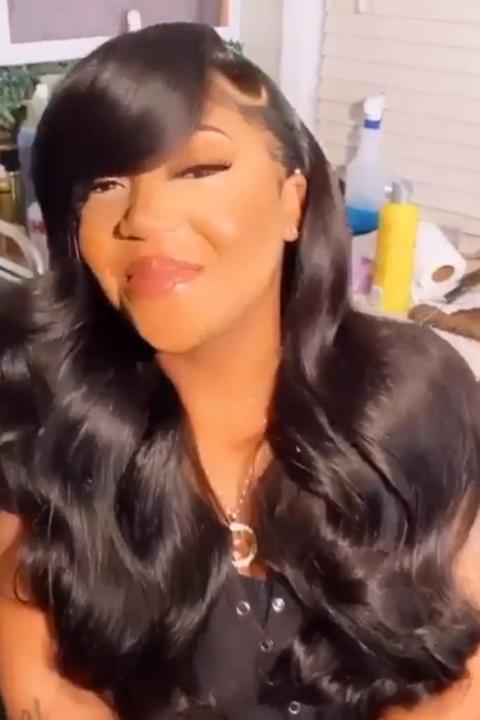 The hair is meticulously styled to maintain its sleekness, with a glossy finish that adds an extra touch of elegance.