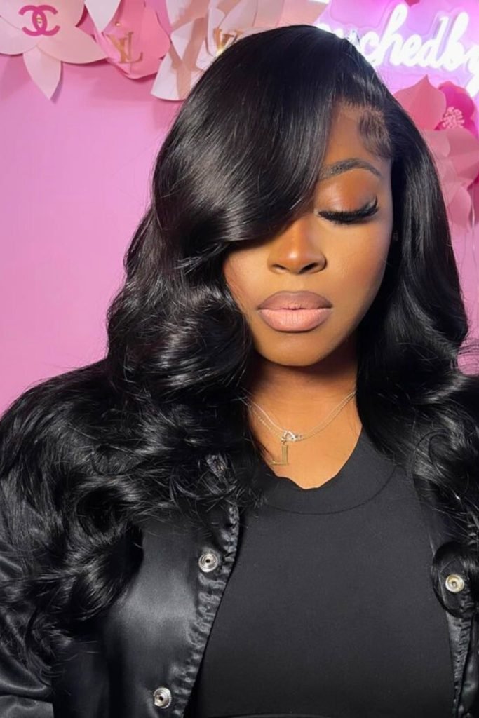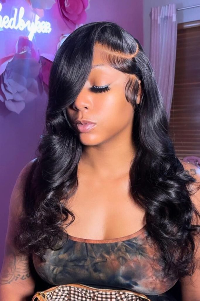 The deep side part creates a dramatic effect, while the smooth, shiny waves add a touch of elegance and sophistication.