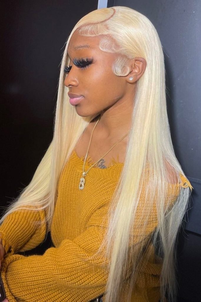 The hair falls smoothly past the shoulders, emphasizing the bold blonde color. The defined side part adds structure, while the intricate baby hair styling at the hairline offers a creative touch.
