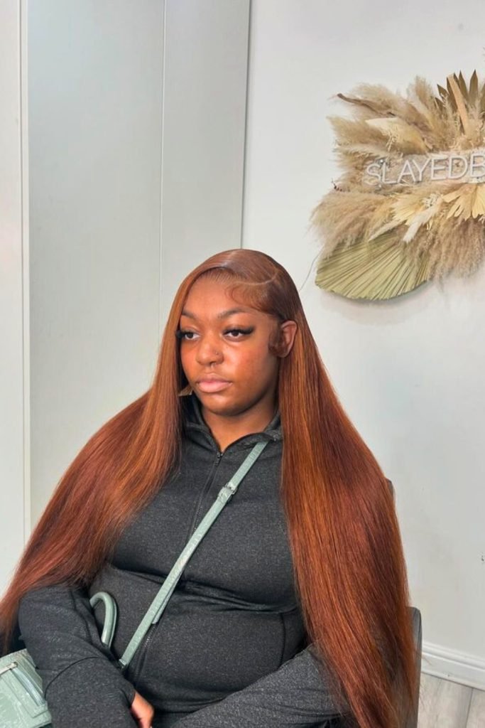 The hair is perfectly straightened, showcasing a glossy and smooth finish that enhances the overall sophistication.