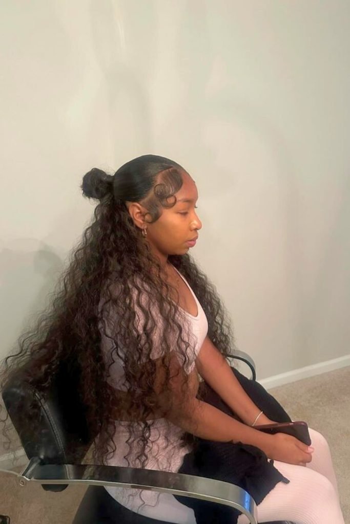 The side-parted half-up bun with curls is a playful yet elegant hairstyle. It features a deep side part, with the top section of the hair pulled back into a neat bun.