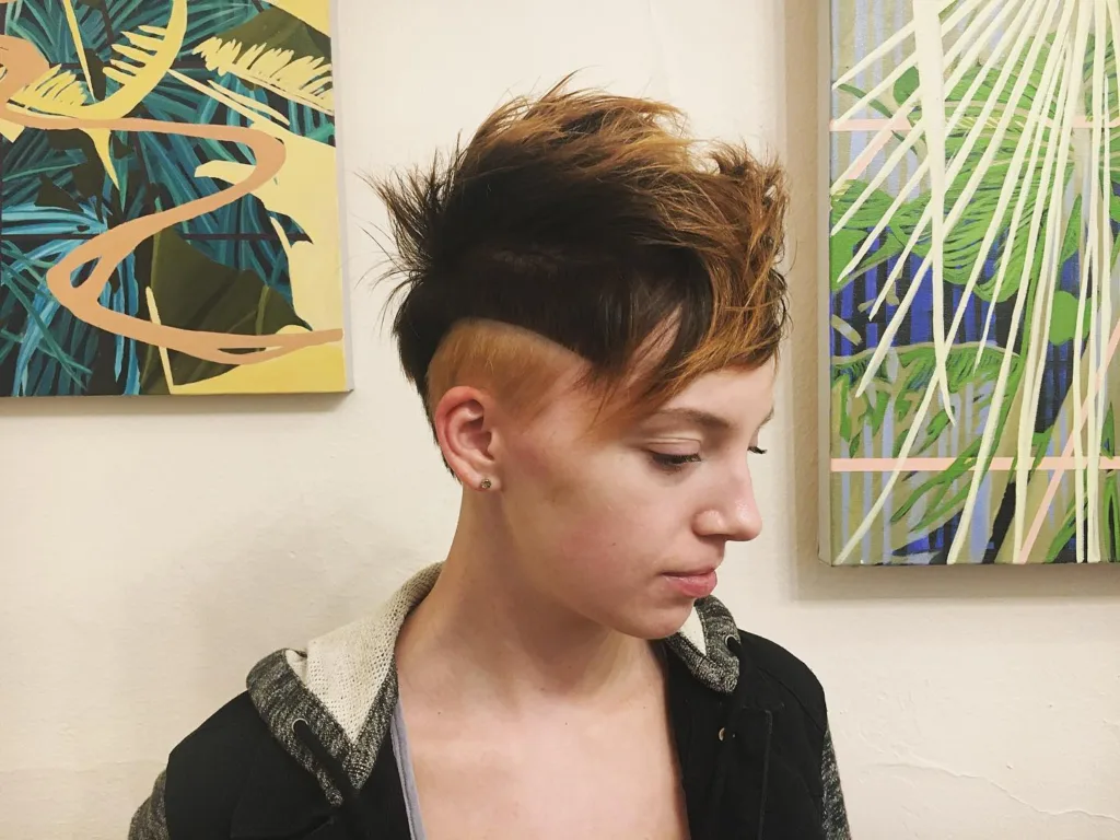 When you want drama without a full shave, the faux hawk is your hero. This version gets a messy spiked-up center with tapered or faded sides. It elongates the face and draws attention to cheekbones and eyes—flattering across all ages. A root-lifting powder like SexyHair’s Powder Play adds serious lift. Whether you’re gifting it or using it yourself, this one’s great for that cool-girl who rides motorcycles (or just looks like she could).