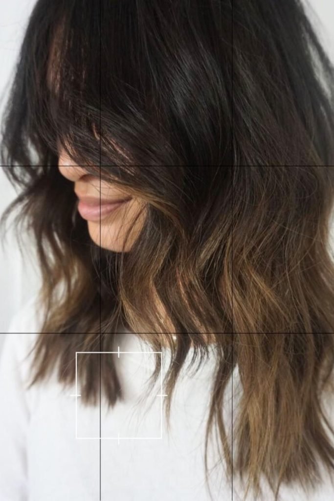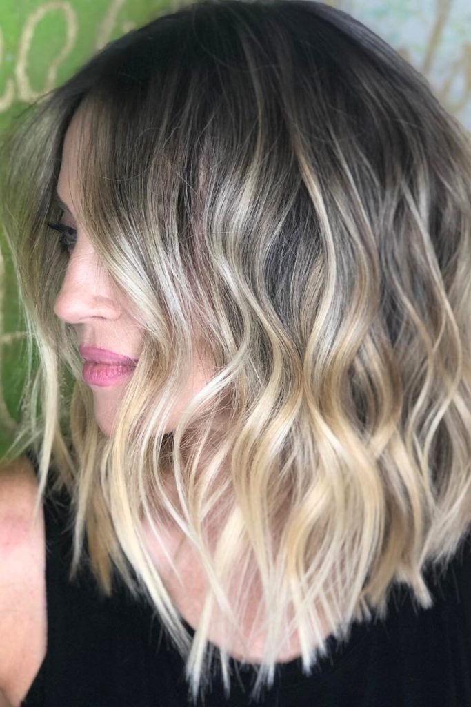 The tousled ombre textured lob features a beautiful transition from dark roots to lighter ends, creating a natural, sun-kissed effect.