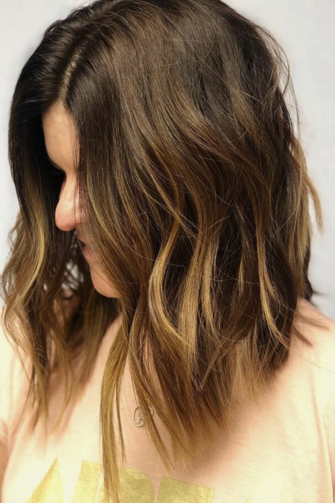 The golden highlights textured lob offers a rich blend of dark brown and golden tones, creating a sun-kissed effect.