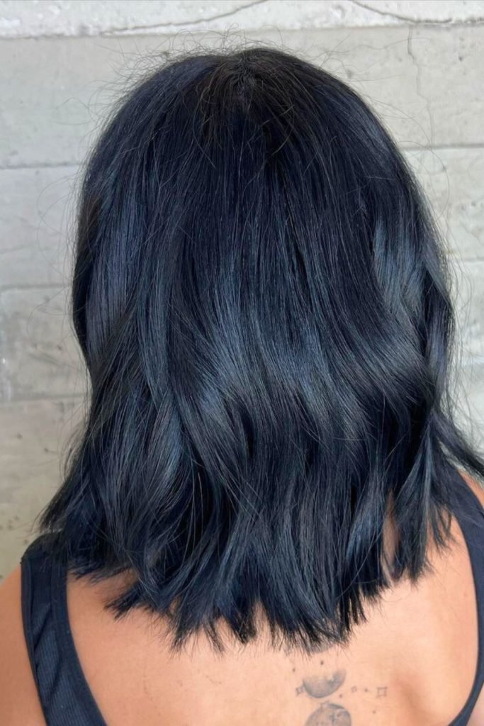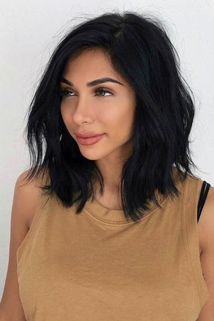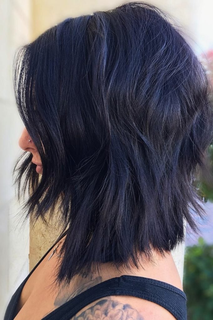 The midnight black textured lob is a bold and striking hairstyle that exudes confidence and sophistication.