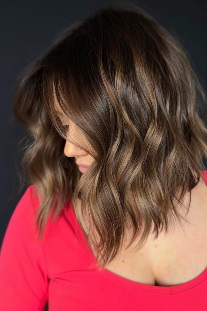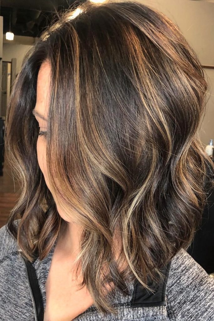 The caramel highlights textured lob combines dark, rich brown tones with warm caramel streaks, creating a multi-dimensional look.