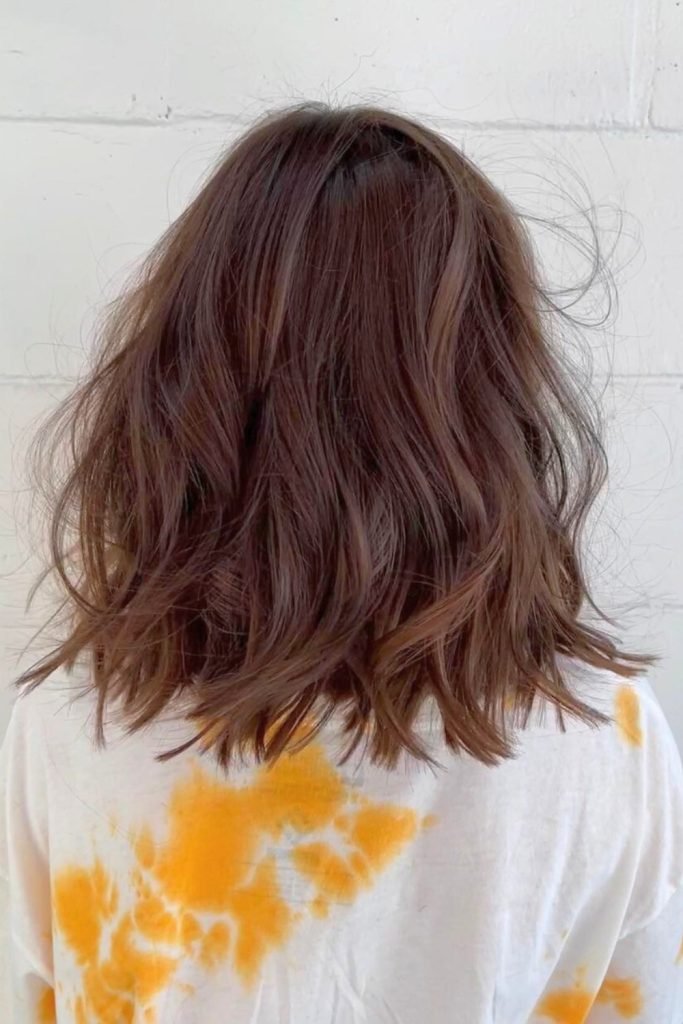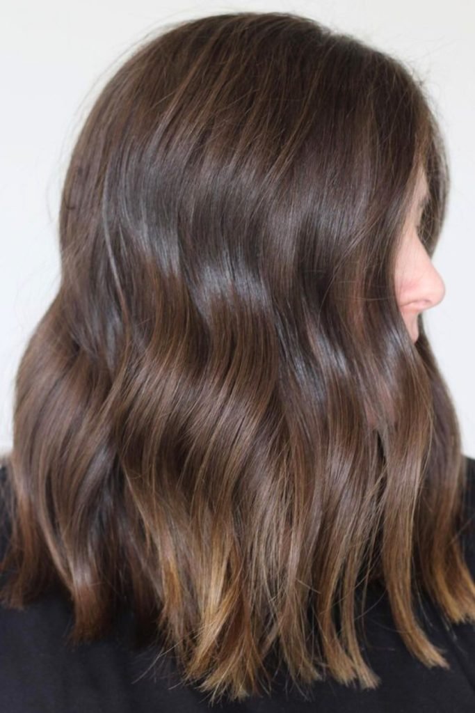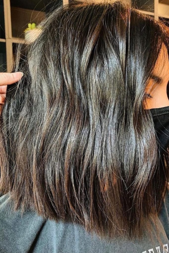 The glossy brown textured lob is a sleek and polished hairstyle that features rich, deep brown tones with a subtle shine.