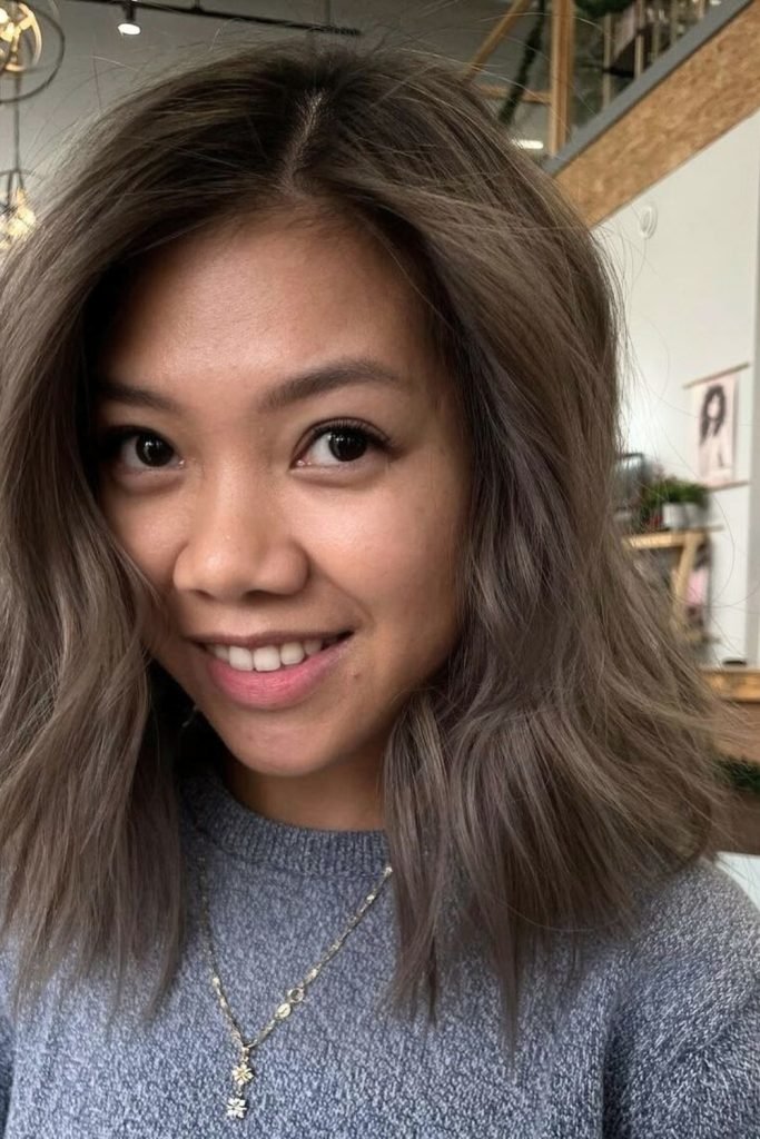The ash-brown textured lob features a blend of dark roots and lighter, ashy brown ends, creating a sophisticated ombre effect.